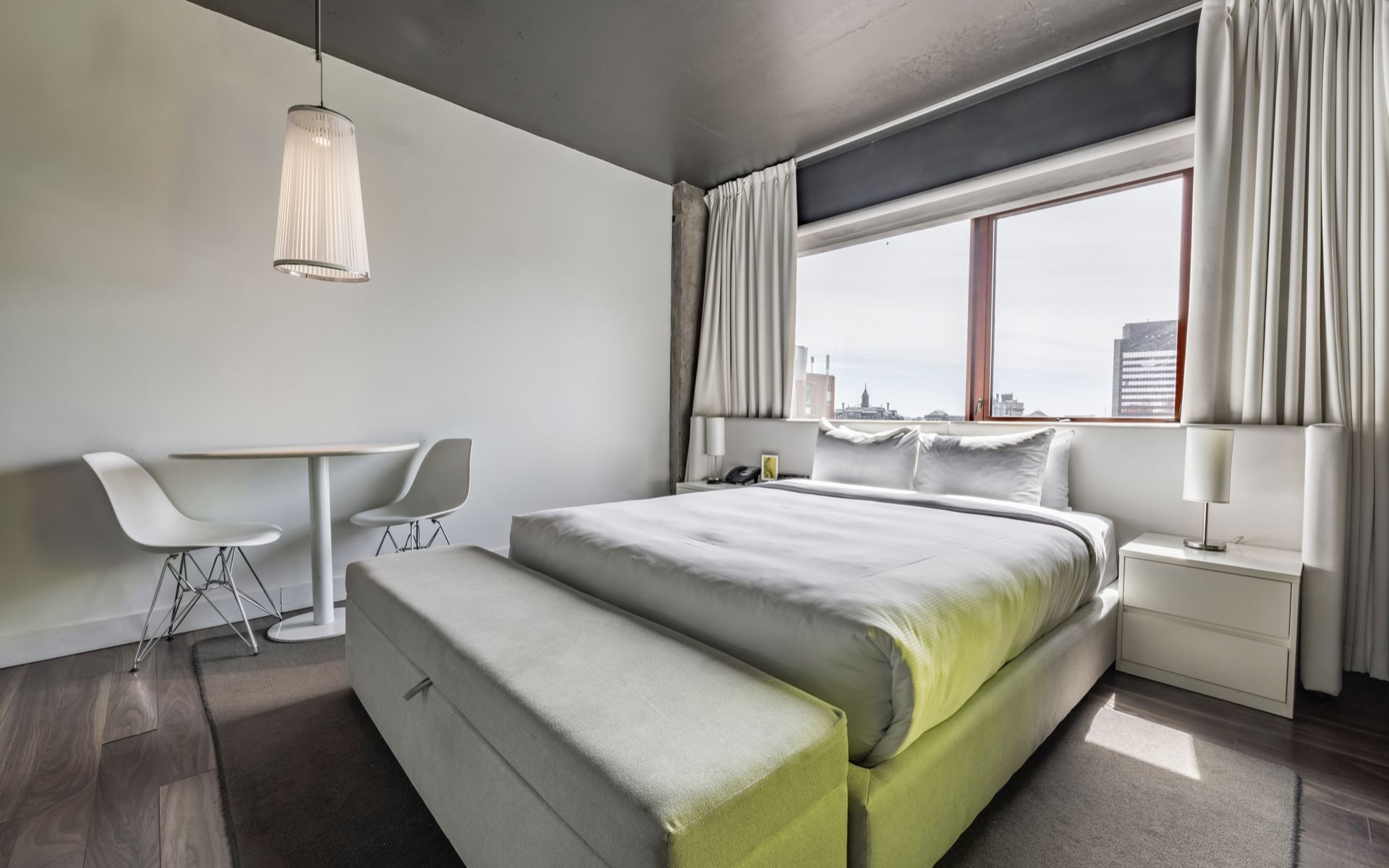Ressentez la sensation de flotter au-dessus de Montréal dans notre impressionnante suite PANORAMA. Fenêtrée du sol au plafond, cette chambre offre une vue à couper le souffle sur le centre-ville.